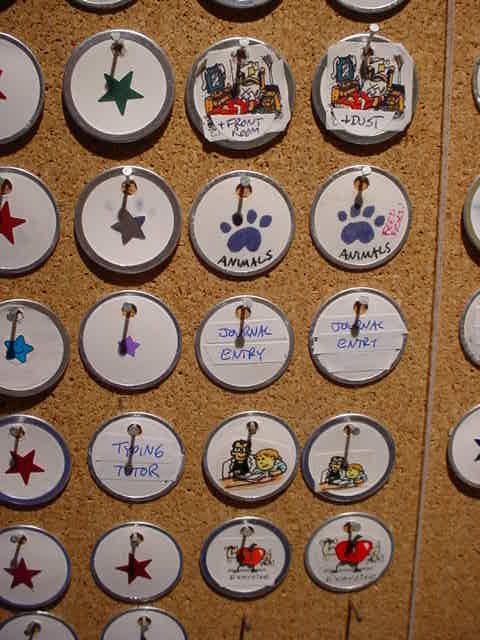 | How it works: I use thumbtacks and string to divide the cork board into sections, one for each child. Before they could read, I put a photo up of each kid. I made a row of nails for each kid, for each day of the week. Use the tags, laid out, to make sure the spacing is right. (I did weekdays only, with a few nails below for weekend days.) At the top of the chart I put letters for M,T,W,Th,F. Before they could read, I used pictures as reminders -- a toothbrush, a pawprint for taking care of pets, a messy room. As they got older, their jobs got more complicated and I could write out details. Chores are set out in the order in which I need them done -- morning routines in the morning, dishwasher unloaded so I can reload all day, clothes set out before bedtime. They are also appropriate to the day of the week. Recycling gets loaded into the van the day before we grocery shop. Wastebaskets are emptied the day before trash pickup. When a kid does a chore, he flips the tag. When the day has a row of shiny stars, the chores are done for the day and it's free time! We've worked out solutions as problems arose. If a kid flipped his "clean your room" tag and it turned out he stuffed it all under the bed, then I make a "checked by mom" tag and nobody's done for the day until mom inspects all jobs. A badly done job results in an added job... usually the dreaded, "SORT SOCKS." If kids seemed uninspired to do chores, I made rules -- usually posted on little square computer-label stickers so nobody forgets -- tying the week's chore completion to weekend nintendo, or full allowance, or some other privilege. I avoid "rewards", because we all pull our weight as part of the family - it's not a favor, it's your job. |