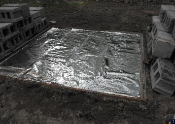 Part Six: stacking blocks. Once the slab was done, I covered it with heavy duty aluminum foil -- in theory, to retain