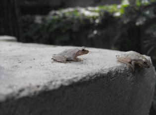 Taking the tarp off the bricks in spring, I evicted some frogs.