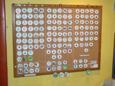 | How it works: I use thumbtacks and string to divide the cork board into sections, one for each child. Before they could read, I put a photo up of each kid. I made a row of nails for each kid, for each day of the week. Use the tags, laid out, to make sure the spacing is right. (I did weekdays only, with a few nails below for weekend days.) At the top of the chart I put letters for M,T,W,Th,F. Before they could read, I used pictures as reminders -- a toothbrush, a pawprint for taking care of pets, a messy room. As they got older, their jobs got more complicated and I could write out details. Chores are set out in the order in which I need them done -- morning routines in the morning, dishwasher unloaded so I can reload all day, clothes set out before bedtime. They are also appropriate to the day of the week. Recycling gets loaded into the van the day before we grocery shop. Wastebaskets are emptied the day before trash pickup. When a kid does a chore, he flips the tag. When the day has a row of shiny stars, the chores are done for the day and it's free time! We've worked out solutions as problems arose. If a kid flipped his "clean your room" tag and it turned out he stuffed it all under the bed, then I make a "checked by mom" tag and nobody's done for the day until mom inspects all jobs. A badly done job results in an added job... usually the dreaded, "SORT SOCKS." If kids seemed uninspired to do chores, I made rules -- usually posted on little square computer-label stickers so nobody forgets -- tying the week's chore completion to weekend nintendo, or full allowance, or some other privilege. I avoid "rewards", because we all pull our weight as part of the family - it's not a favor, it's your job. |