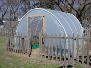 | It's not gorgeous, but I have spinach already, and last weekend we had hail and snow. Yes, in April. (Welcome to Ohio.) Anyway, I built a simple H shape out of scrap lumber, and buried the legs under the front end arch of my hoop house. Then I cobbed the old wooden screen door right off the back of my house, cut it down by 16 inches with a circular saw and reattached the screen. My kids were really amused. They told on me when their daddy got home from work. "Mommy took the screen door right off the house!" He just sighed and went to Home Depot to buy another one. He's a good sport. |