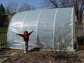 | So we're all pretty happy. My kids are impressed. After I took these pix I did one more thing: I drove wooden stakes along the side walls, screwed eyes (like from hook and eyes) into the top of each one, then ran a thin white nylon cord across the top of the hoop house in gap between each "rib". Then I used two small bungee cords to attach the rope to the stakes, one on either side. When the wind really blows, the hoop house puffs out like it's going to sail to the neighbor's... so the tie-downs seem to keep it a bit more secure, and not so flappy when it's windy. Anyway I just had to show you these pictures because I'm really happy. This is my kind of project. It cost almost nothing, I could do it by myself in a weekend,and I am going to have the earliest tomatoes in this part of Ohio. ;0) |