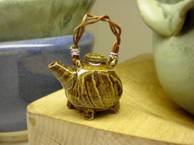 Thrown and faceted teapot with wild cucumber cane handle. 1" tall, ^6